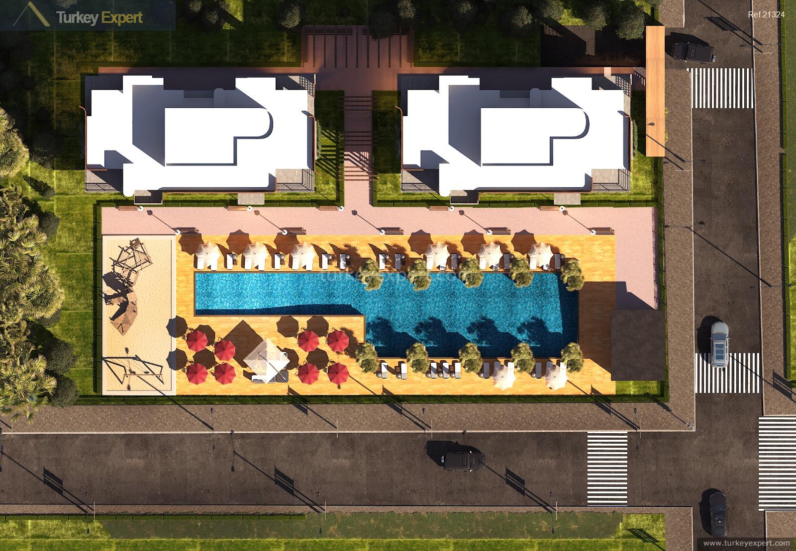 Located in the scenic area of Dösemealti, Antalya, this apartment complex offers a blend of modern comforts and tranquil outdoor spaces. Families will appreciate the children's playground and outdoor swimming pool, while fitness enthusiasts can make use of the gym facilities. The complex is designed with elegantly landscaped paths and features 24-hour security, ensuring a safe and pleasant living environment. Residents can also enjoy the convenience of covered parking and automatic entrance gates.
