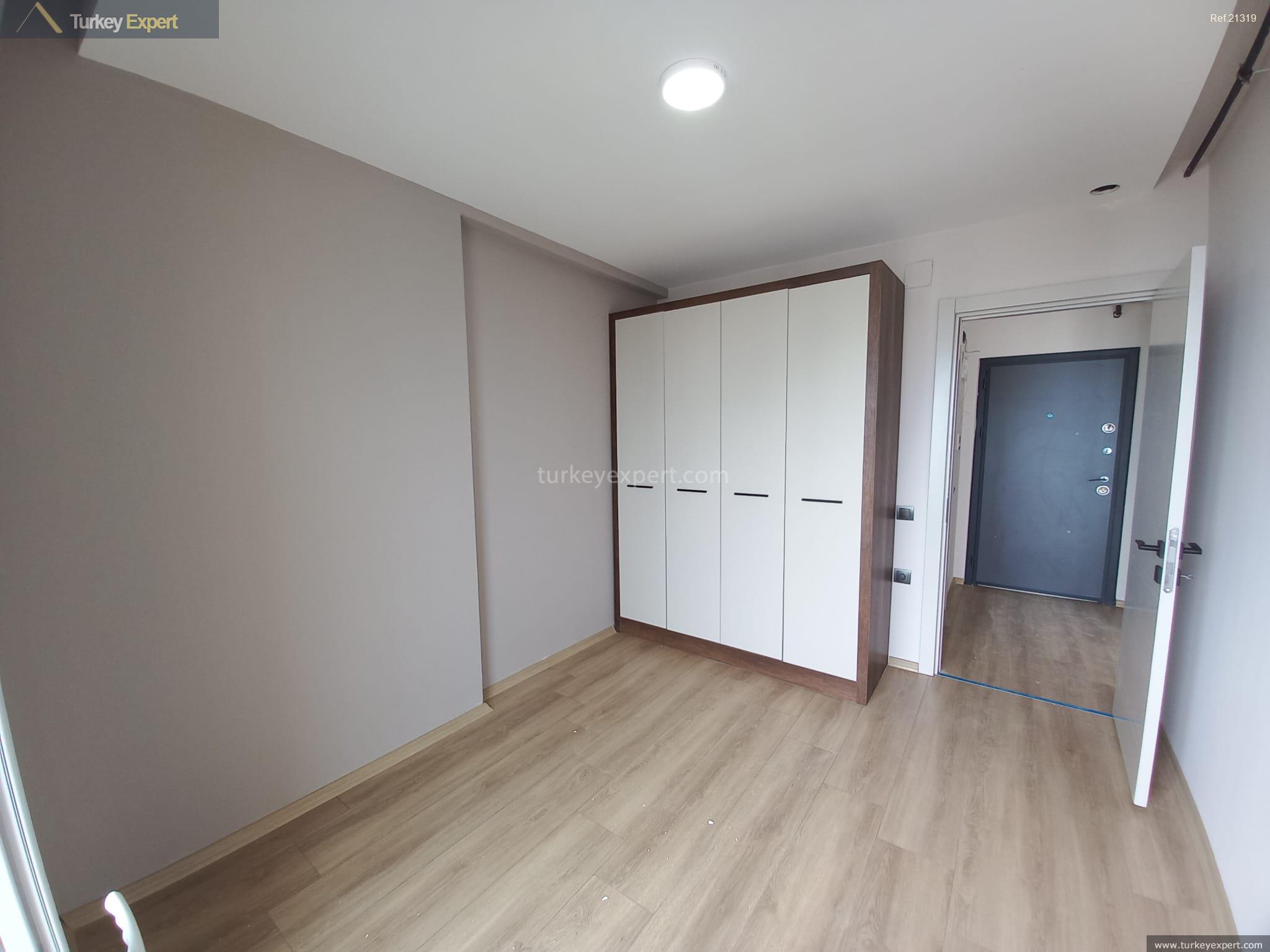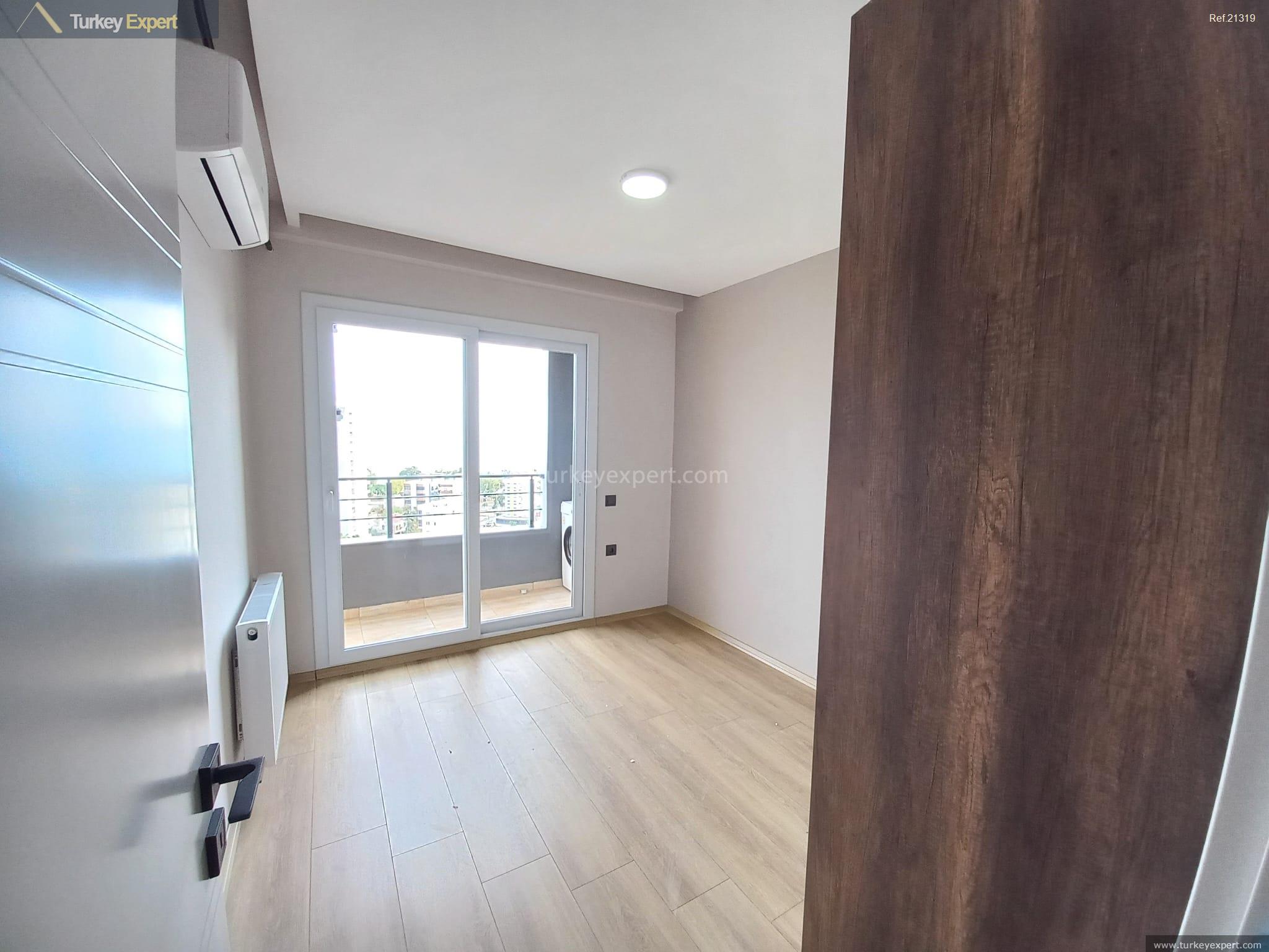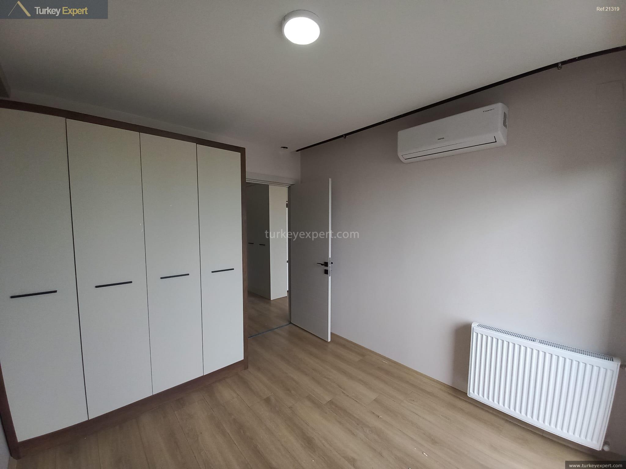 The walls are coated with waterproof satin paint, complemented by high-quality PVC double-glazed windows, ensuring comfort throughout the seasons. The apartment's ceilings are crafted with plasterboard, and entry through a durable stainless-steel door provides security and peace of mind. Residents will also benefit from air conditioning and a color video intercom system.