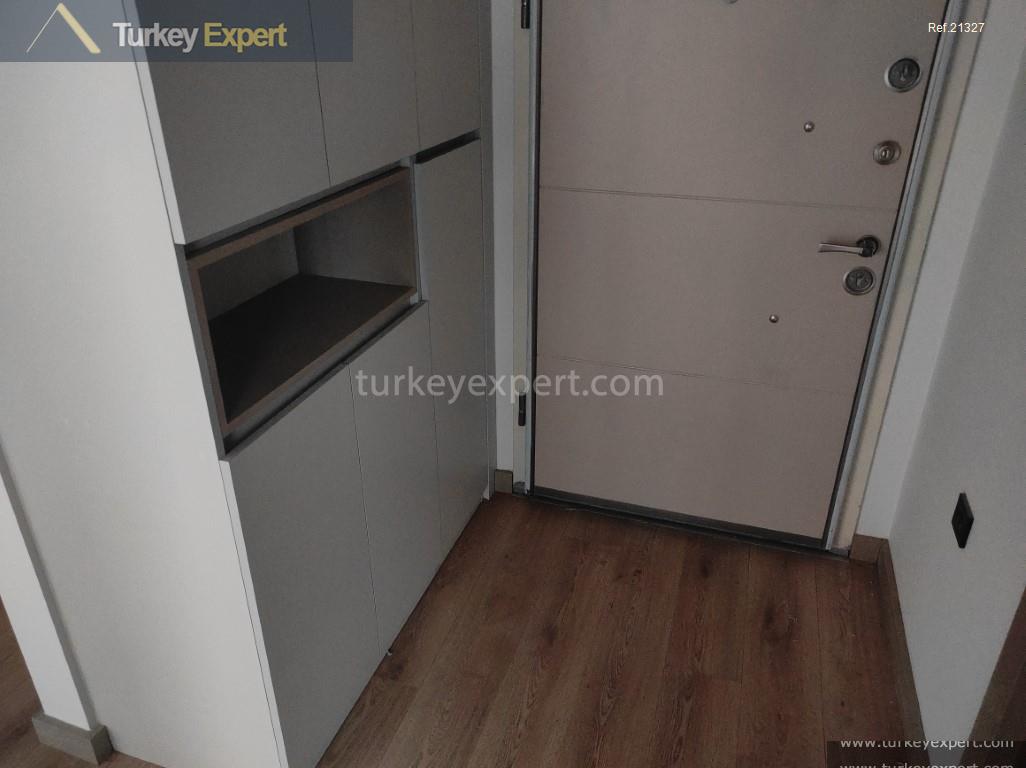 The apartment kitchen and hallway feature built-in furniture, optimizing space and functionality. Enjoy modern conveniences with household appliances including an oven, stove, and extractor hood. A central satellite antenna keeps you connected, and automatic external blinds offer privacy with ease.