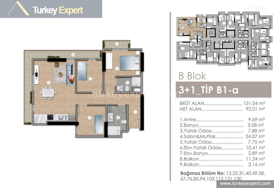 The project offers a diverse portfolio of 480 residential units in 1+1, 2+1, and 3+1 layouts ranging from 68 to 131 sqm, complemented by expansive commercial shops ranging from 178 to 1,070 sqm, catering to business owners and retailers alike.